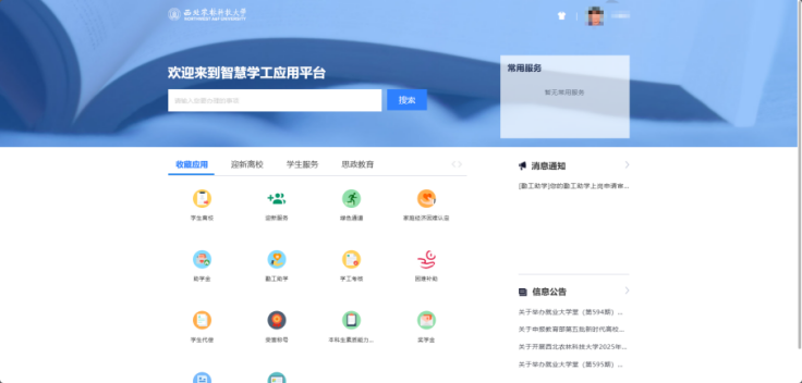 图 2 学生服务应用、消息通知及信息公告界面