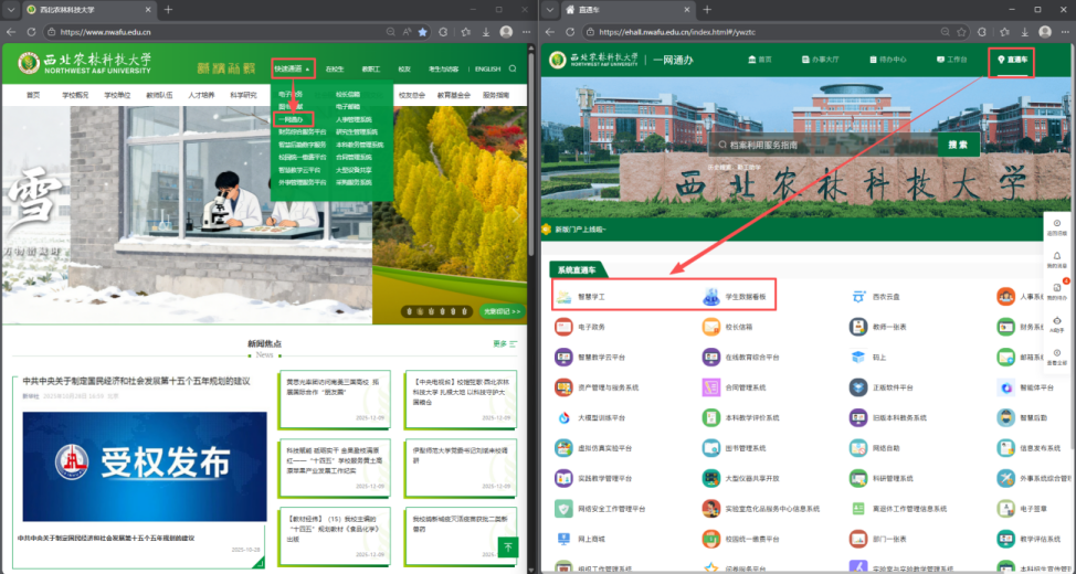 PC端:登录学校官网“一网通办”→点击“直通车”→选择“学生数据看板”或“智慧学工”相应模块即可进入。