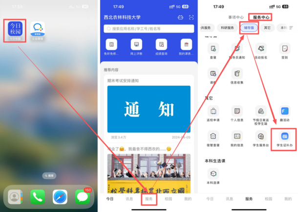 4.一般情况下,3-5个工作日后即可办理完成,证件补办完成后“今日校园”/“企业微信”APP将收到内部消息通知(须打开APP消息通知权限),提醒大家及时领取;如需加急办理,待【院级管理员审核】通过后,可携带【一寸近期免冠证件照】前往北校区“一站式”学生社区服务大厅(西区雕塑向北50米处)进行办理。