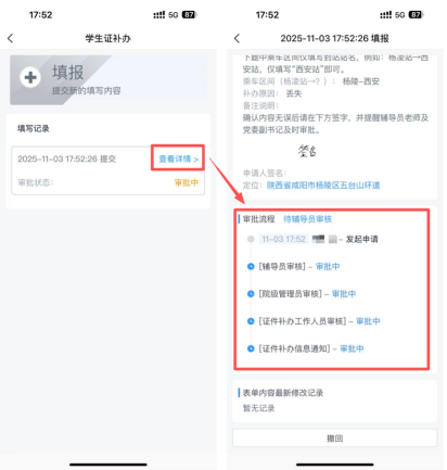 3.提交后可在申请界面查看详情,查询审批进度。