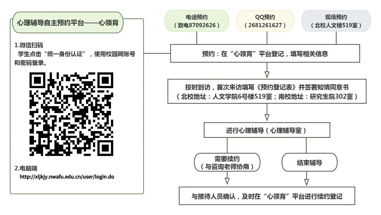 温馨提示:每学期第一周在“西农素质教育”公众号发布新学期咨询值班表。开学第一周如果急需心理支持,也欢迎通过辅导员协助联系,或直接拨打87092626预约咨询。