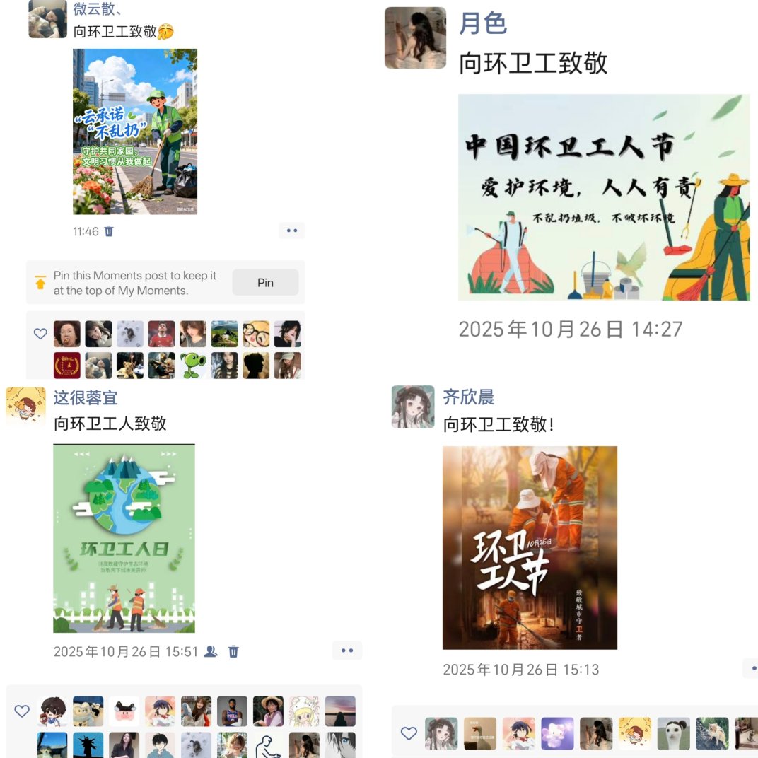 活动引发了参与同学的积极反响。大家普遍感受到:亲手设计承诺卡的过程,本身就是一次对环卫工人辛勤付出的深度共情;而将承诺公开发布至朋友圈,则让个人的文明倡议转化为一种有约束力的集体监督。许多同学表示,这种“云承诺”的形式,让他们切身体会到,文明并非遥不可及的口号,而是始于指尖、源于内心的自觉行动,每一次分享都是一次正能量的传播与接力。