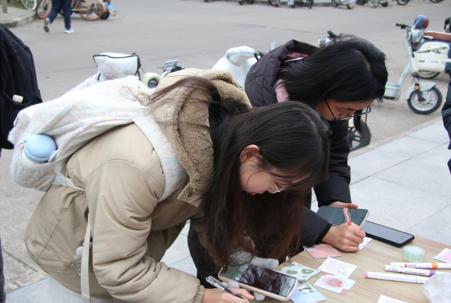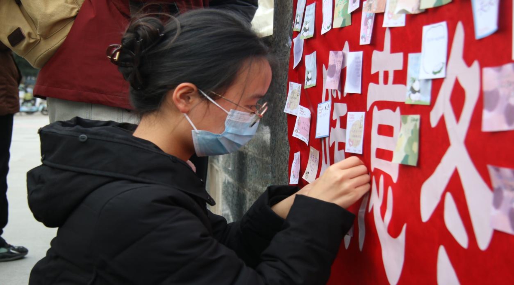 活动当天,志愿者们不顾寒冷,化身为冬日里的“暖流使者”,早早来到西雕广场布置现场,有条不紊地推进各项准备工作,在墙面挂上“暖意冬至 情满校园”的红色横幅,在旁边整齐摆放着笔具,并且精心挑选了各式各样的便签,等待着同学们的妙笔生花。一句句细致的介绍,一次次温柔的回应,志愿者们用真诚与热情搭建起沟通的桥梁,同学们也纷纷响应,认真写下冬至的祝福,让志愿精神与温暖之心在这片校园里脉脉相传。